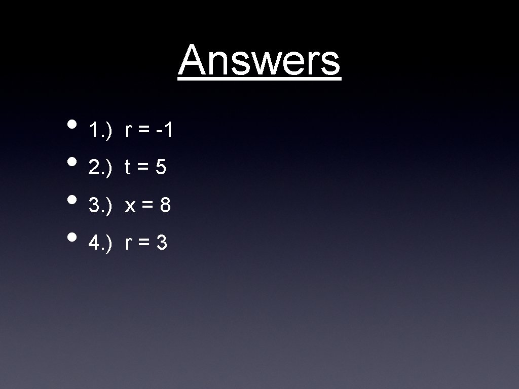 Practice Problems - do these in your notebook • Solve the Equation. • 1. ) r + 3 = 2 • 2. ) -1 = t - 6 • 3. ) x + 4 - 3 = 9 • 4. ) r - (-2) = 5