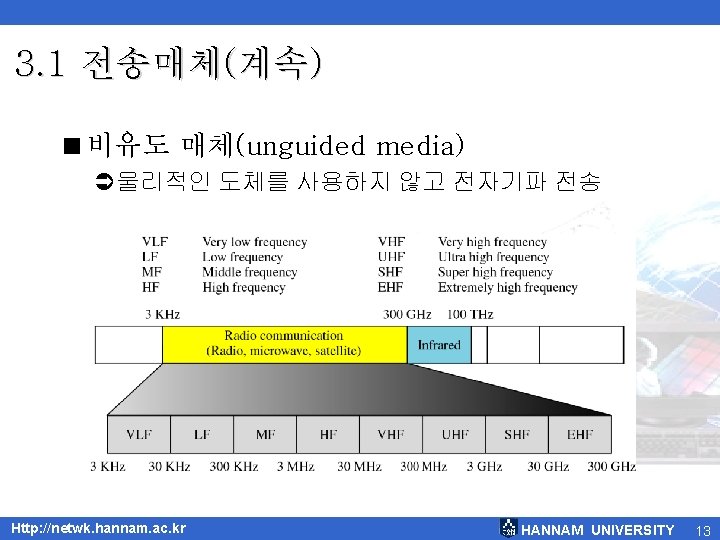 3. 1 전송매체 Transmission media 유도매체 비유도매체 Guided media Unguided media Http: //netwk. hannam. ac. kr HANNAM UNIVERSITY 2
