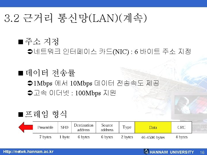 3. 2 근거리 통신망(LAN)(계속) <이더넷 Ü접근방법 : (CSMA/CD ; Carrier Sense Multiple Access with Collision Detection) Http: //netwk. hannam. ac. kr HANNAM UNIVERSITY 15
