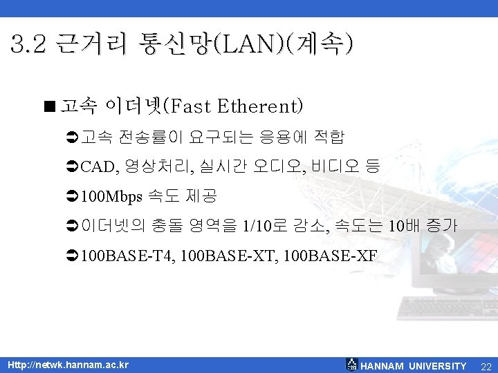 3. 2 근거리 통신망(LAN)(계속) <10 BASE-T : twisted pair Ethernet Http: //netwk. hannam. ac. kr HANNAM UNIVERSITY 21