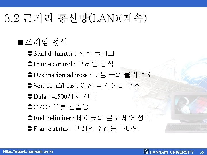 3. 2 근거리 통신망(LAN)(계속) <FDDI(Fiber Distributed Data Interface) Ü전송 방법 : 토큰 전달 Ü전송률 : 100 Mbps 지원 Ü프레임 형식 Http: //netwk. hannam. ac. kr HANNAM UNIVERSITY 28