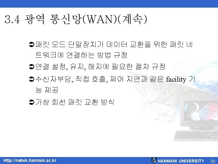 3. 4 광역 통신망(WAN)(계속) < X. 25 패킷 구조 Ü 물리층(physical layer) w X. 21, X. 21 bis 프로토콜 사용 Ü 데이터 링크층(link access procedure, balanced layer, LAPB) w 비트 중심 프로토콜 Ü 네트워크층(packet layer protocol, PLP) w 연결, 설정, 데이터 전송, 연결 해지 기능 Http: //netwk. hannam. ac. kr HANNAM UNIVERSITY 39