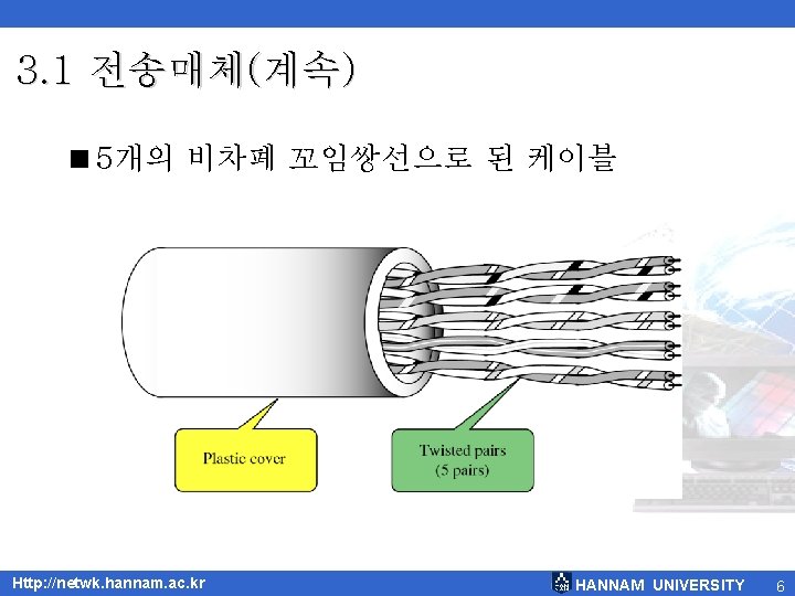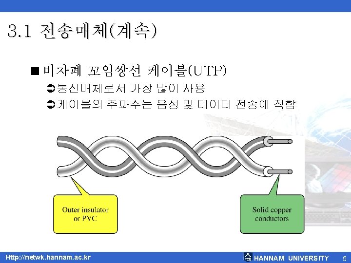 3. 1 전송매체(계속) <꼬임쌍선 케이블(twisted-pair cable) 꼬임쌍선 케이블 Twisted-Pair Cable 비차폐 꼬임쌍선 케이블 Unshielded Twisted-Pair Cable Shielded Twisted-Pair Cable Http: //netwk. hannam. ac. kr HANNAM UNIVERSITY 4