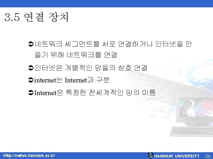 3. 5 연결 장치(계속) <연결 장치 Connecting devices Networking devices Repeaters Http: //netwk. hannam. ac. kr Bridges Internetworking devices Routers Gateways HANNAM UNIVERSITY 59