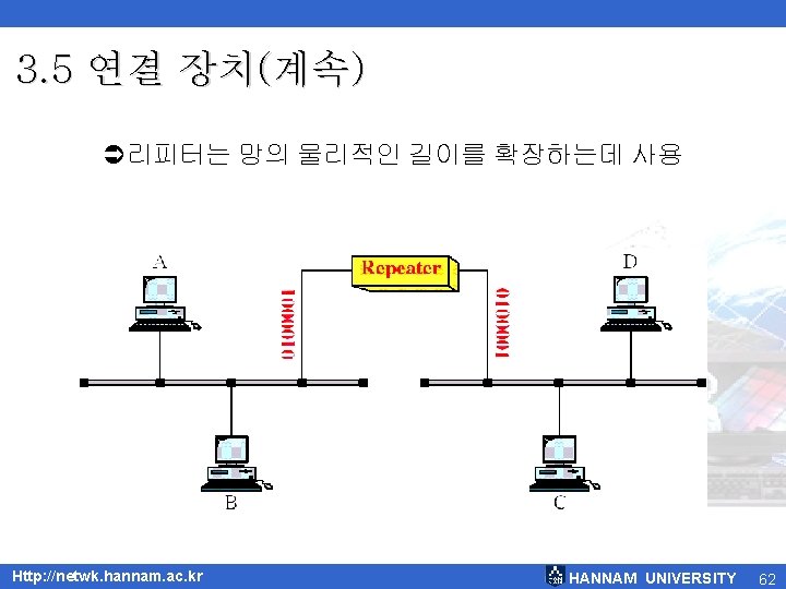 3. 5 연결 장치(계속) <리피터(Repeater) ÜOSI 모델의 물리층 기능을 수행하는 장치 Http: //netwk. hannam. ac. kr HANNAM UNIVERSITY 61
