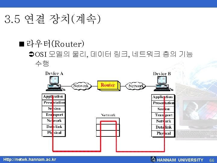 3. 5 연결 장치(계속) <연결장치와 OSI 모델 Application Presentation Gateway Application Presentation Session Transport Network Router Network Data link Bridge Data link Physical Repeater Physical Http: //netwk. hannam. ac. kr HANNAM UNIVERSITY 60