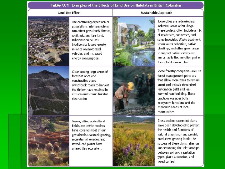 The Effects of Land Resource Use § All of the land around us, even in cities, was once a part of an ecosystem. § We use the land for things like urban development, agriculture, industry, mining and forestry § “Land use” refers to the way we use the land. § “Resource use” refers to the ways we obtain and use naturally occurring materials. § Most products you use every day involve the use of some natural resources in their production. The processing and export of resources like lumber, coal and sulphur are very important to BC’s current economy.