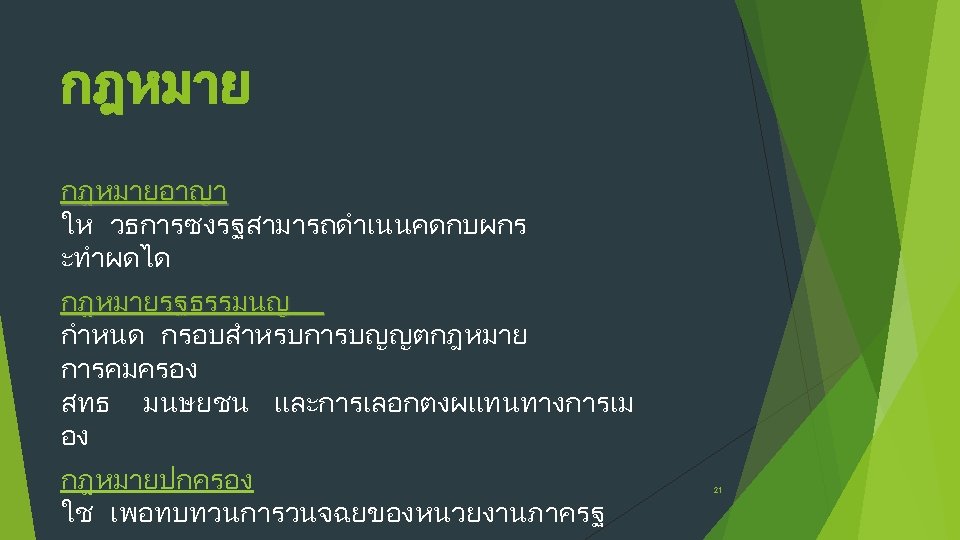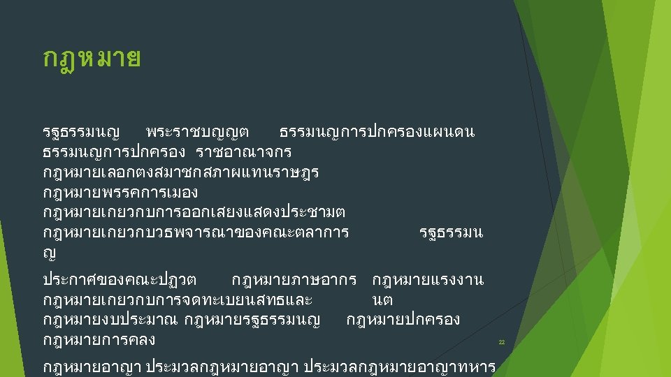 Thai Legislation. 1 Economic 1. 1 Forest Act, 1941 1. 2 National Reserved Forest Act, 1964 1. 3 Forest Plantation Act, 1992 1. 4 Agricultural Land Reform Act, 1975 1. 5 Land for the Livelihood Act, 1968 30