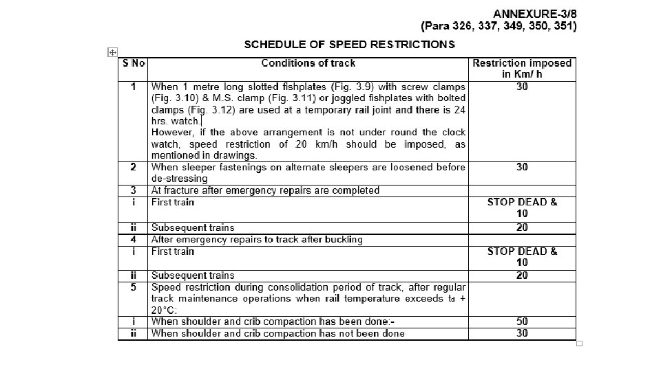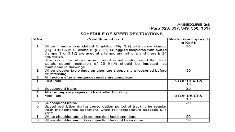 Repairs to buckled track. (contd. . ) (i) Emergency repairs: • The buckled rails shall preferably be gas cut adequately apart not less than 6. 5 m. The track shall then be slewed to the correct alignment and cut rails of the required lengths shall be inserted to close the gaps making due provision for welding of joints on both sides. The cut rails shall then be connected by use of special fishplates and screw clamps and the line opened to traffic with speed restriction as indicated in Annexure-3/8.