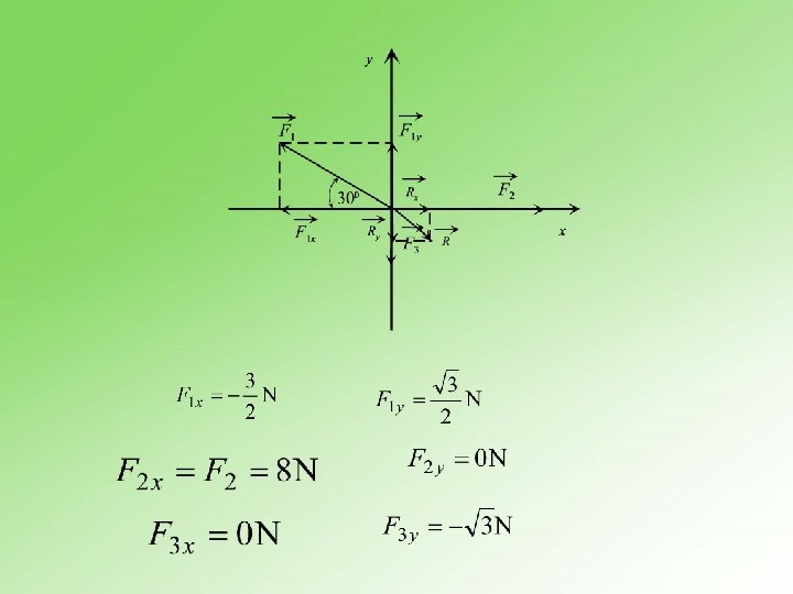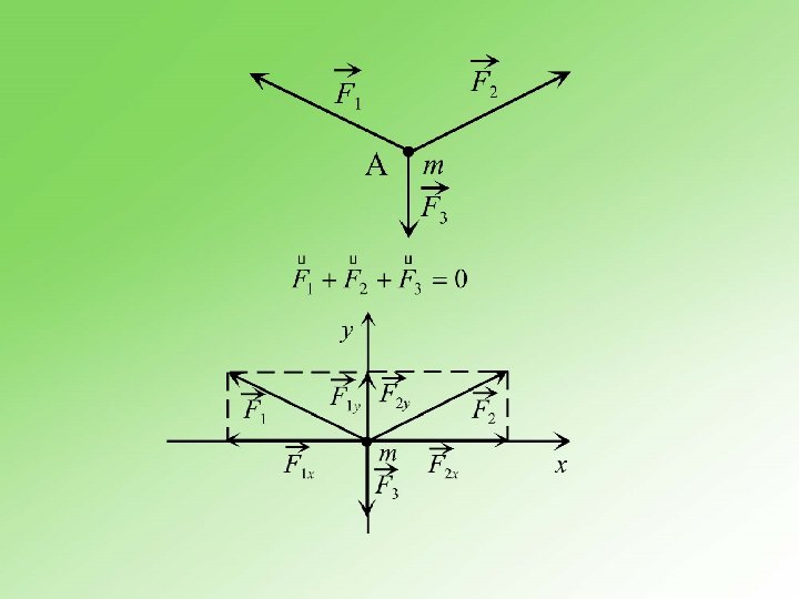 n Primer Kada na materijalnu tačku deluju tri sile, tada vektorski zbir sila treba da bude jednak nuli da bi materijalna tačka bila u ravnoteži, vidi sliku 3. 12. 2.