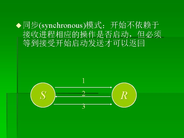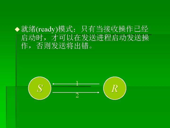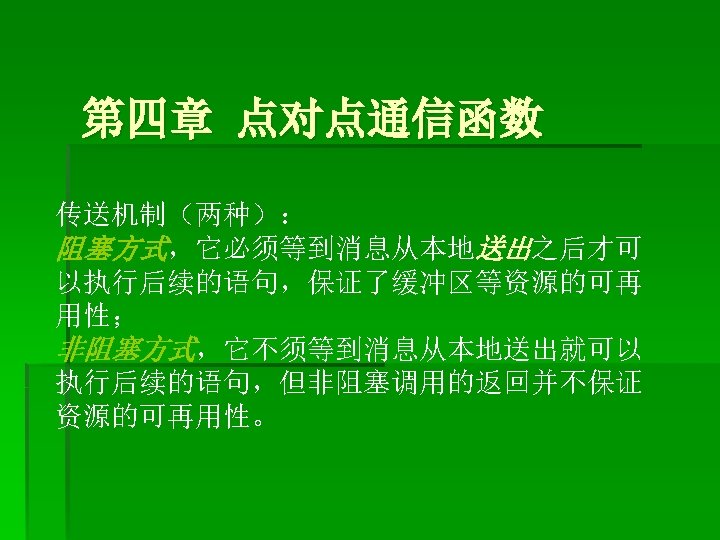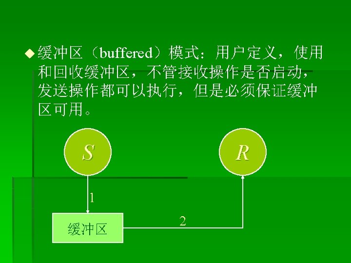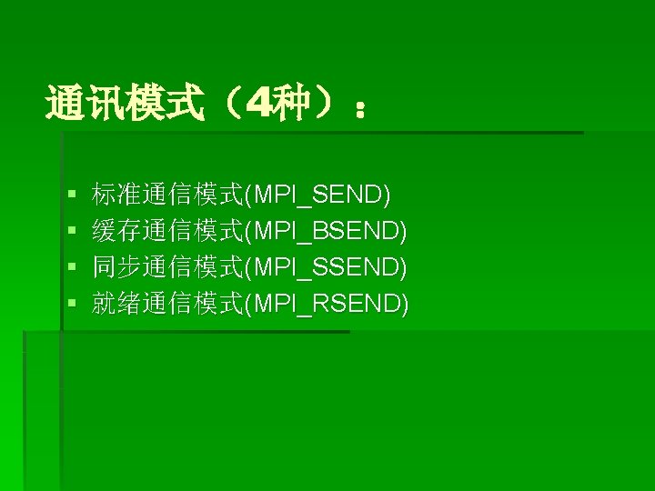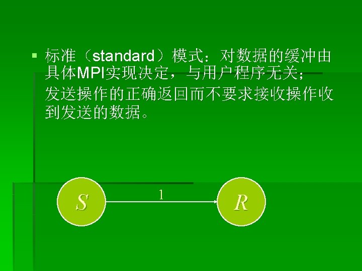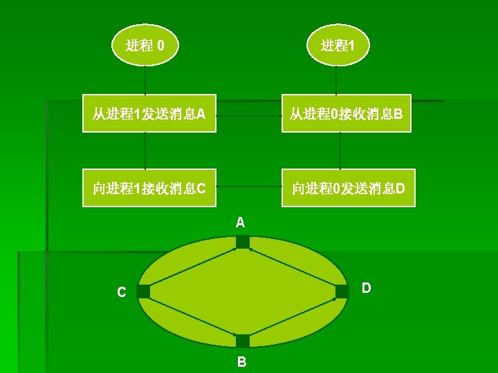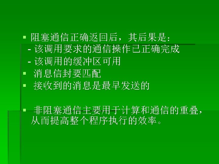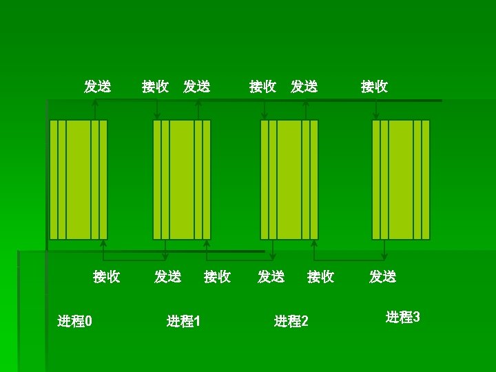 改进: § MPI_Isend(buf 1, LENGTH, MPI_CHAR, clock, tag, MPI_COMM_WORLD, &req uest); § MPI_Recv(buf 2, LENGTH, MPI_CHAR, anticlock, tag, MPI_COMM_WORLD, & status); § MPI_Wait(&request, &status); § ----------------- § MPI_Irecv(buf 2, LENGTH, MPI_CHAR, anticlock, tag, MPI_COMM_WORLD, &r equest); § MPI_Send(buf 2, LENGTH, MPI_CHAR, clock, tag, MPI_COMM_WORLD); § MPI_Wait(&request, &status);