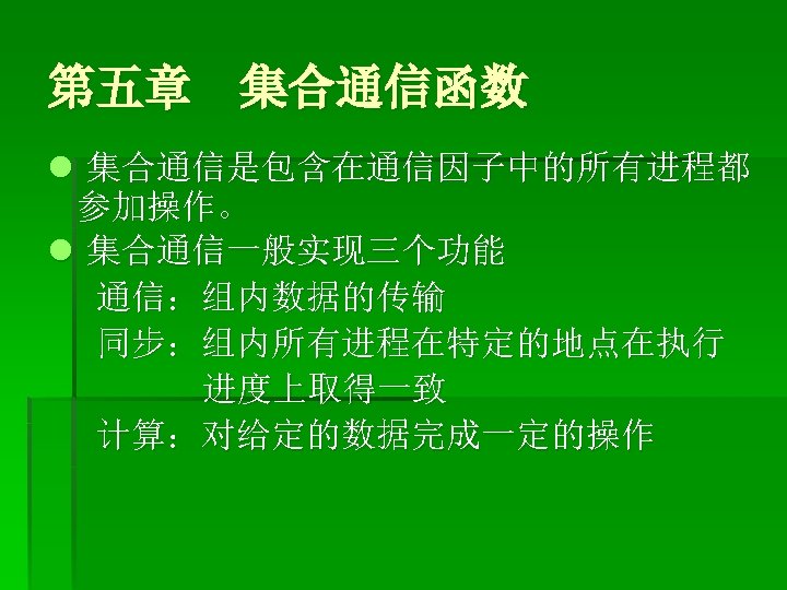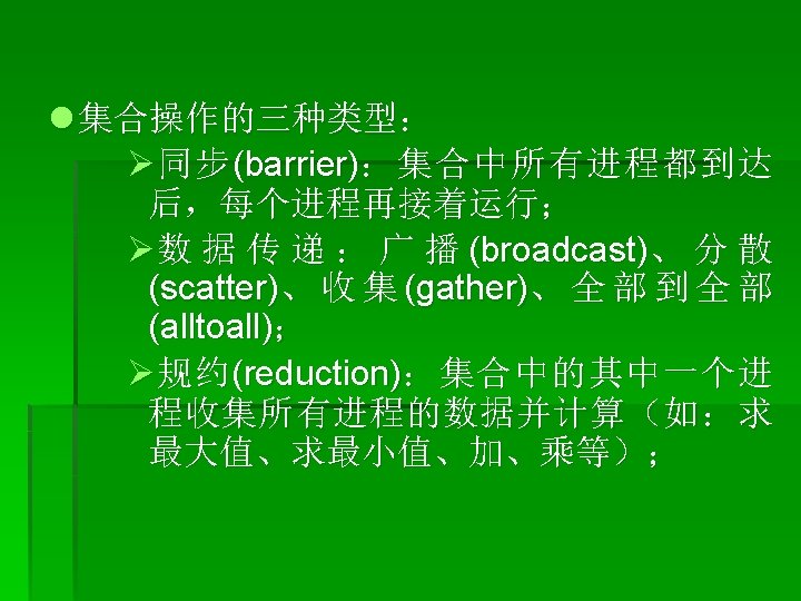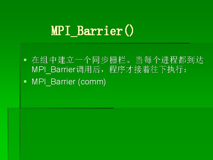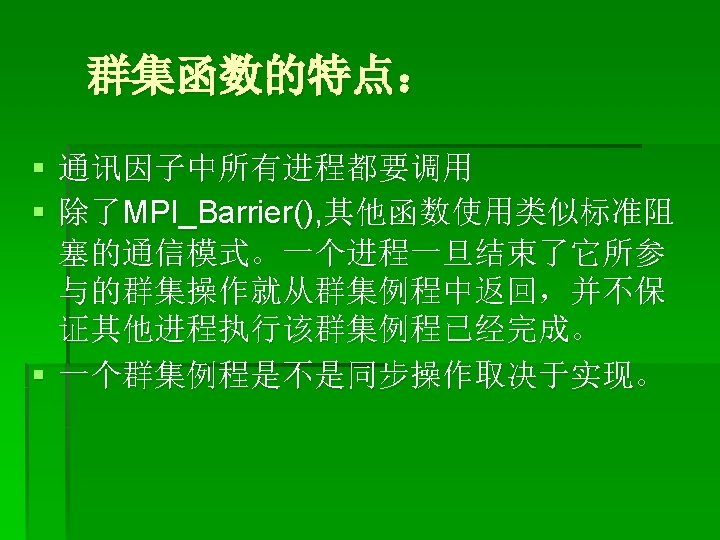集合通信函数 § § § MPI_Barrier MPI_Bcast MPI_Scatter MPI_Gather MPI_Scan MPI_Reduce