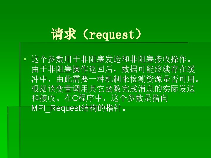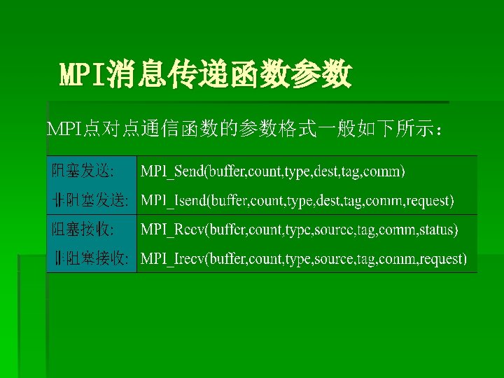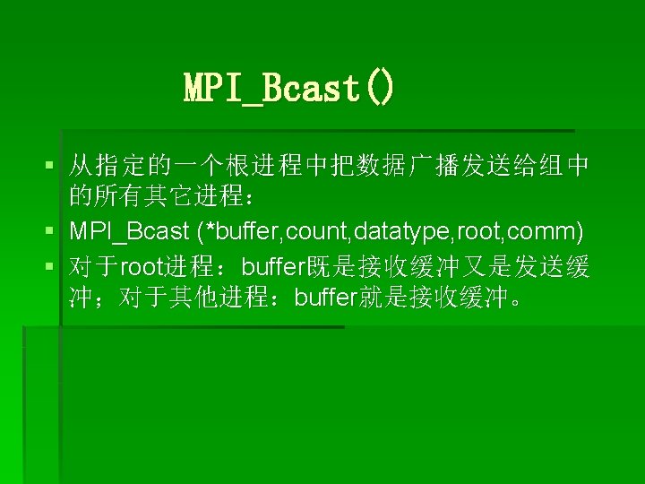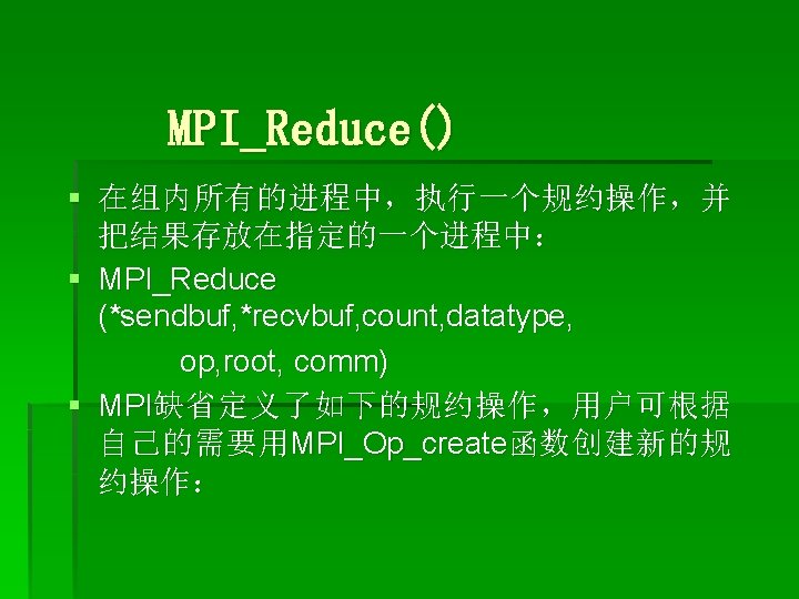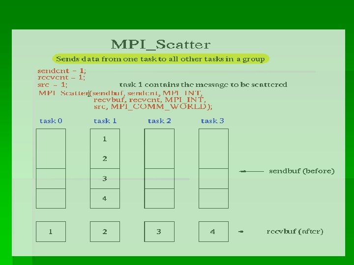 MPI_Scatter() § 把根进程中的数据分散发送给组中的所有进程( 包括自己): § MPI_Scatter (*sendbuf, sendcnt, sendtype, *recvbuf, recvcnt, recvtype, root, comm) root用 MPI_Send(sendbuf, sendcount·n, sendtype, …)发送一个消息。这个消息分成n个 相等的段,第i个段发送到进程组的第i个进程, sendcnt必须要和recvcnt相同。