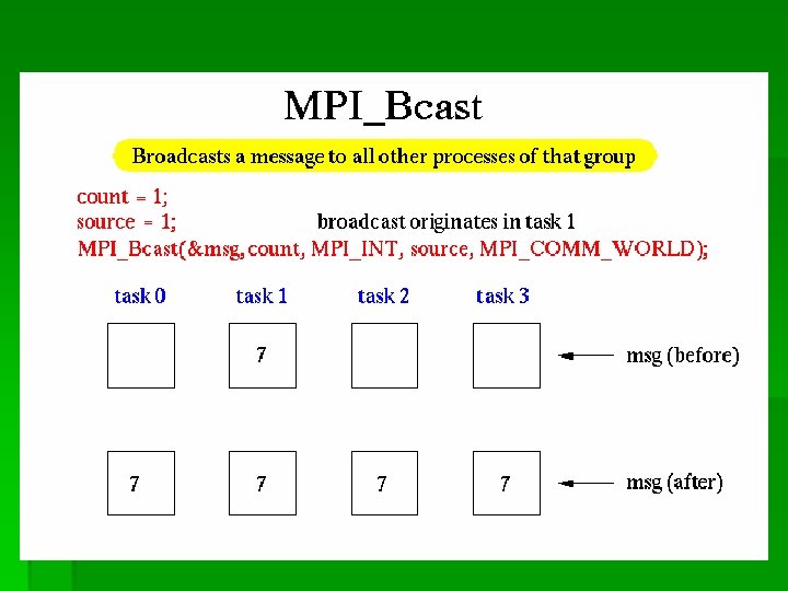 ![/*Make data table */ table =(int *)calloc(size, sizeof(int)); table[rank]=rank+1; /*准备要广播的数据*/ MPI_Barrier (MPI_COMM_WORLD); /*将数据广播出去*/ for /*Make data table */ table =(int *)calloc(size, sizeof(int)); table[rank]=rank+1; /*准备要广播的数据*/ MPI_Barrier (MPI_COMM_WORLD); /*将数据广播出去*/ for](https://slidetodoc.com/presentation_image_h2/d738bfeaa49d9a1e00ea4c7152457168/image-24.jpg)