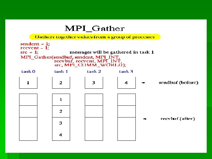 MPI_Gather() § 在组中指定一个进程收集组中所有进程发送来的 消息,这个函数操作与MPI_Scatter函数操作相 反: § MPI_Gather (*sendbuf, sendcnt, sendtype, *recvbuf, ecvcount, recvtype, root, comm)