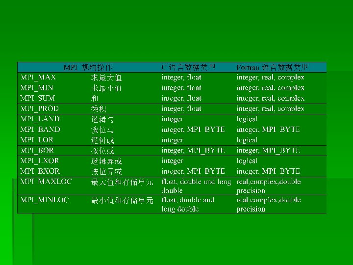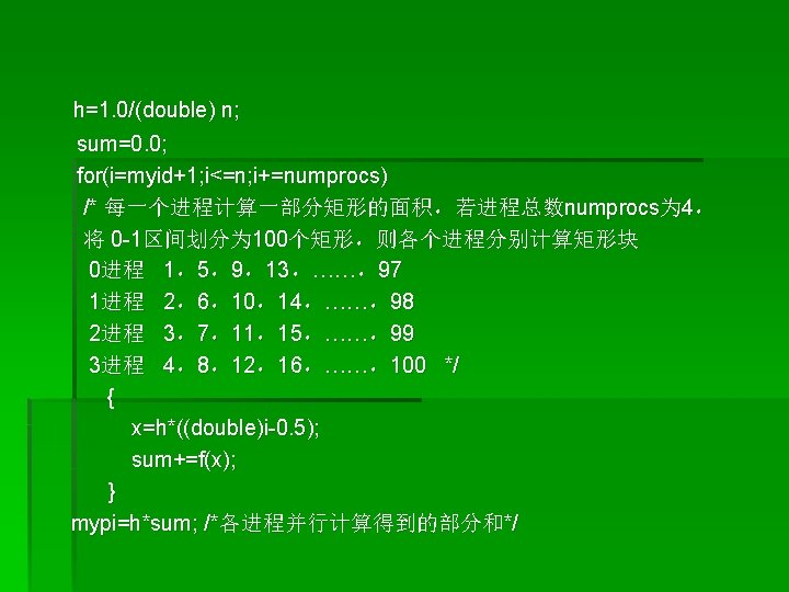 /*将部分和累加得到所有矩形的面积,该面积和即为近似PI值*/ MPI_Reduce(&mypi, &pi, 1, MPI_DOUBLE, MPI_SUM, 0, MPI_COMM_WORLD); if(myid==0) { printf(“pi is approximately %. 16 f, Error is %. 16 fn”, pi, fabs(pi-PI 25 DT)); endwtime=MPI_Wtime(); printf(“wall clock time=% fn”, endwtime-startwtime); fflush(stdout); } MPI_Finalize(); }