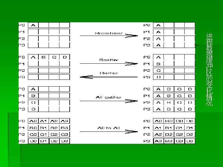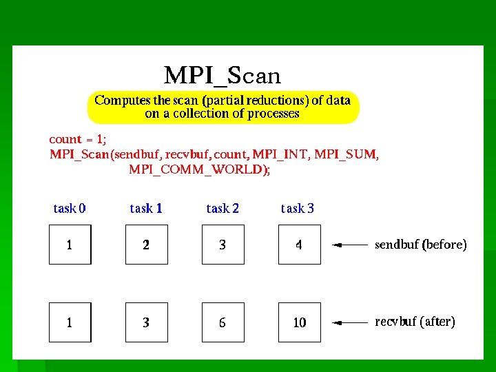 MPI_Scan() § 用来对分布在进程组上的数据执行前缀归约: § MPI_Scan (*sendbuf, *recvbuf, count, datatype, op, comm)