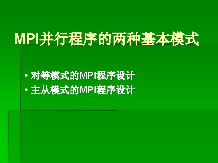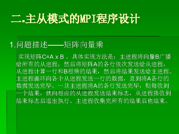 * else (若所有行都已发送出去,则每接收一个消息则向相应的从进程发 送一个标志为 0的空消息,终止该从进程的执行) call MPI_SEND(1. 0, 0, MPI_DOUBLE_PRECISION, sender, 0, MPI_COMM_WORLD, ierr) end if end do else * * (下面为从进程的执行步骤,首先是接收数组B) call MPI_BCAST(b, cols, MPI_DOUBLE_PRECISION, master, MPI_COMM_WORLD, ierr) (接收主进程发送过来的矩阵A一行的数据) call MPI_RECV(buffer, cols, MPI_DOUBLE_PRECISION, master, MPI_ANY_TAG, MPI_COMM_WORLD, status, ierr)