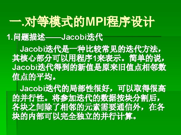 程序 11、 并行的Jacobi迭代 program main include ‘mpif. h’ integer totalsize, mysize, steps Parameter (totalsize=16) (定义全局数组的规模) parameter (mysize=totalsize/4, steps=10) integer n, myid, numprocs, i, j, rc Real a(totalsize, mysize+2), b(totalsize, mysize+2) Integer begin_col, end_col, ierr Integer status(MPI_STATUS_SIZE)