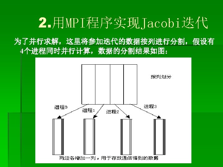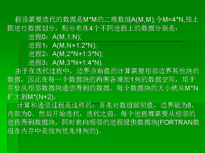 call MPI_INIT(ierr) call MPI_COMM_RANK(MPI_COMM_WORLD, myid, ierr) call MPI_COMM_SIZE(MPI_COMM_WORLD, numprocs, ierr) print *, ”Process”, myid, ” of”, numprocs, ” is alive” (数组初始化) do j=1, mysize+2 do i=1, totalsize a(i, j)=0. 0 end do If (myid. eq. 0) then do i=1, totalsize a(i, 2)=8. 0 end do end if