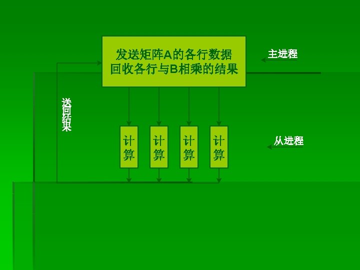 (若接收到标志为 0的消息,则退出执行) if (status(MPI_TAG). ne. 0) then row=status(MPI_TAG) ans=0. 0 do I=1, cols ans=ans+buffer(i)*b(j) end do (计算一行的结果,并将结果发送给主进程) call MPI_SEND(ans, 1, MPI_DOUBLE_PRECISION, master, row, MPI_COMM_WORLD, ierr) goto 90 end if call MPI_FINALIZE(ierr) end