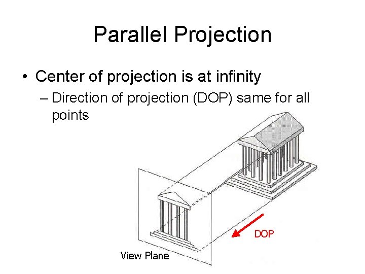 Parallel Projection • Center of projection is at infinity – Direction of projection (DOP) same for all points DOP View Plane