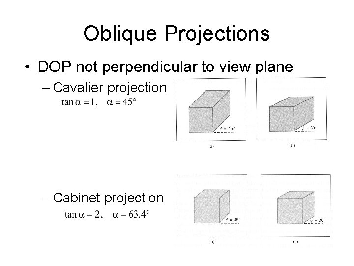 Oblique Projections • DOP not perpendicular to view plane Cavalier (DOP at 45 ) Cabinet (DOP at 63. 4 )