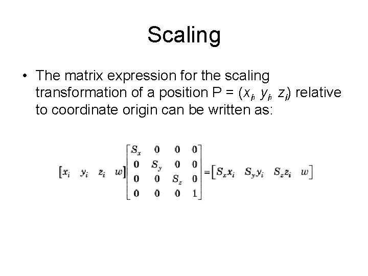 Scaling • The matrix expression for the scaling transformation of a position P = (xi, yi, zi) relative to coordinate origin can be written as: