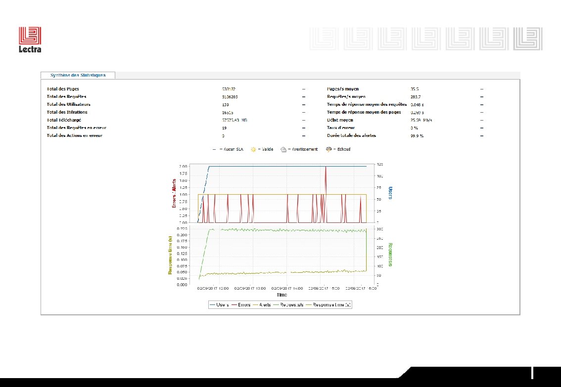Performance Test: 120 Virtual Users / 5 h Nb Pages total 244870 Pages/s moyen 13, 6 Nb Hits total 1249512 Hits/s moyen 69, 4 Nb Utilisateurs total 200 Temps de réponse moyen de requête 0, 216 s Nb Itérations total 1711 Temps de réponse moyen de page 1, 09 s Débit total Taux d'erreur 7823. 41 Mo 0% Débit moyen Nb Action Erreurs total 3, 48 Mb/s 0