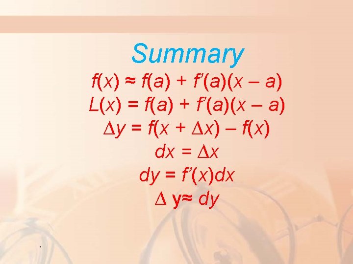 LINEAR APPROXIMATION Equation 1 The approximation f(x) ≈ f(a) + f’(a)(x – a) is called the linear approximation or tangent line approximation of f at a.