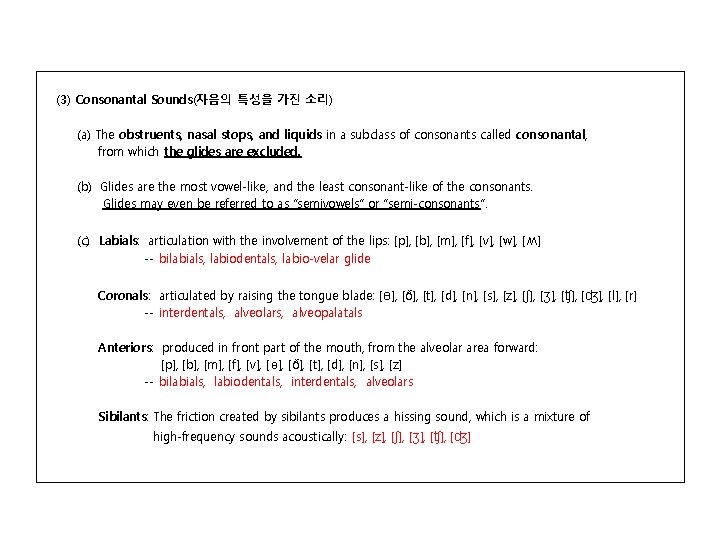 (3) Consonantal Sounds(자음의 특성을 가진 소리) (a) The obstruents, nasal stops, and liquids in a subclass of consonants called consonantal, from which the glides are excluded. (b) Glides are the most vowel-like, and the least consonant-like of the consonants. Glides may even be referred to as “semivowels” or “semi-consonants”. (c) Labials: articulation with the involvement of the lips: [p], [b], [m], [f], [v], [w], [ ʍ] -- bilabials, labiodentals, labio-velar glide Coronals: articulated by raising the tongue blade: [ ɵ], [ð], [t], [d], [n], [s], [z], [ʃ], [ʒ], [ʧ], [ʤ], [l], [r] -- interdentals, alveolars, alveopalatals Anteriors: produced in front part of the mouth, from the alveolar area forward: [p], [b], [m], [f], [v], [ɵ], [ð], [t], [d], [n], [s], [z] -- bilabials, labiodentals, interdentals, alveolars Sibilants: The friction created by sibilants produces a hissing sound, which is a mixture of high-frequency sounds acoustically: [s], [z], [ʃ], [ʒ], [ʧ], [ʤ]