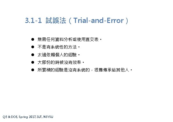 第 3. 1節 實驗設計法 Methods of Experimental Design 3. 1 -1 試誤法(Trial-and-Error) 3. 1 -2 一次一因子實驗法(One-Factor-at-a-Time) 3. 1 -3 全因子實驗法(Full-Factorial Experiments) 3. 1 -4 田口式直交表實驗法(Taguchi’s Orthogonal Arrays) 3. 1 -5 交互作用及可疊加性(Interactions and Additivity) 3. 1 -6 預測最佳設計下的品質特性(Prediction) 3. 1 -7 實驗模式(Empirical Models) QE & DOE, Spring 2017, IUT, NSYSU
