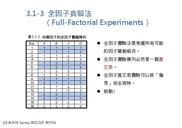 全因子實驗法 表 3. 1 -4 全因子實驗例子之數據及因子效應 Exp. 1 2 3 4 5 6 7 8 9 10 11 12 13 14 15 16 Level 1 Level 2 Effect A 1 1 1 1 2 2 2 2 0. 44 0. 99 0. 55 B 1 1 1 1 2 2 2 2 0. 58 0. 84 0. 26 C 1 1 2 2 0. 93 0. 49 -0. 44 QE & DOE, Spring 2017, IUT, NSYSU D 1 2 1 2 0. 65 0. 77 0. 13 y 0. 43 0. 60 0. 01 0. 18 0. 76 0. 88 0. 21 0. 42 1. 02 1. 13 0. 59 0. 68 1. 29 1. 34 0. 86 0. 96 How to calculate the effect of B?