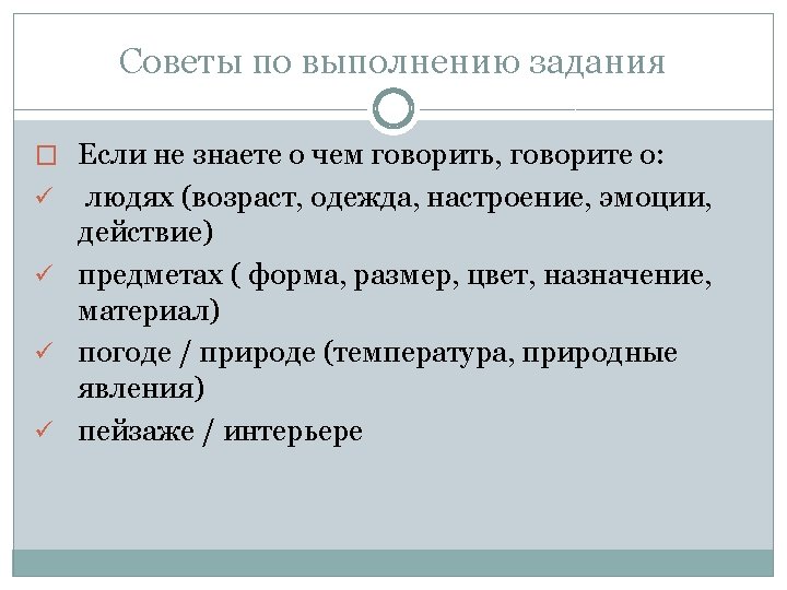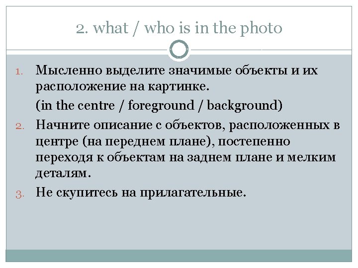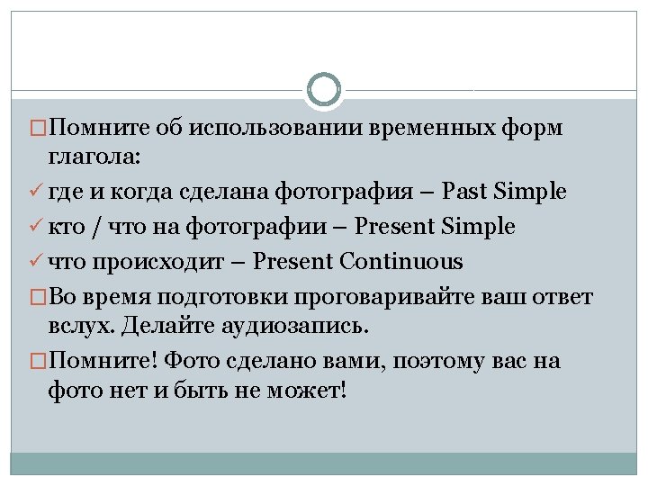 5. why you decided to show the picture to your friend �I felt like showing this picture to you … �I decided to show this picture to you … ü … because you’ve never seen my family before and asked me how we usually spend our free time. ü … because I wanted you to see how close and happy our family is. ü … to make you feel how amazing it could be to spend a weekend with your relatives. ü … (!) so as to share my emotions (experience) with you, as it was really an exciting and unforgettable day