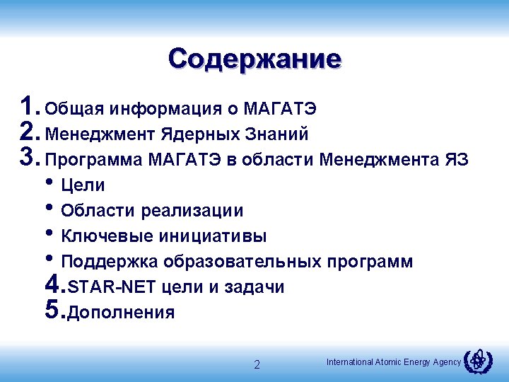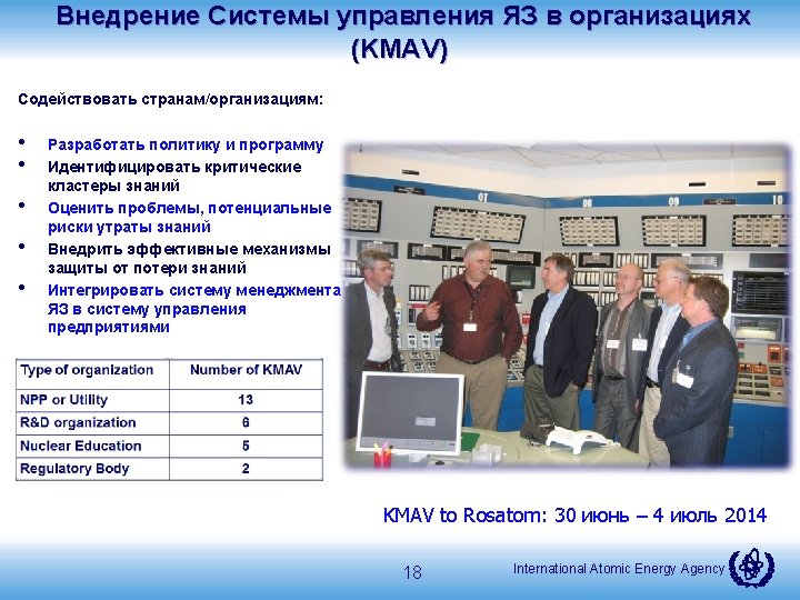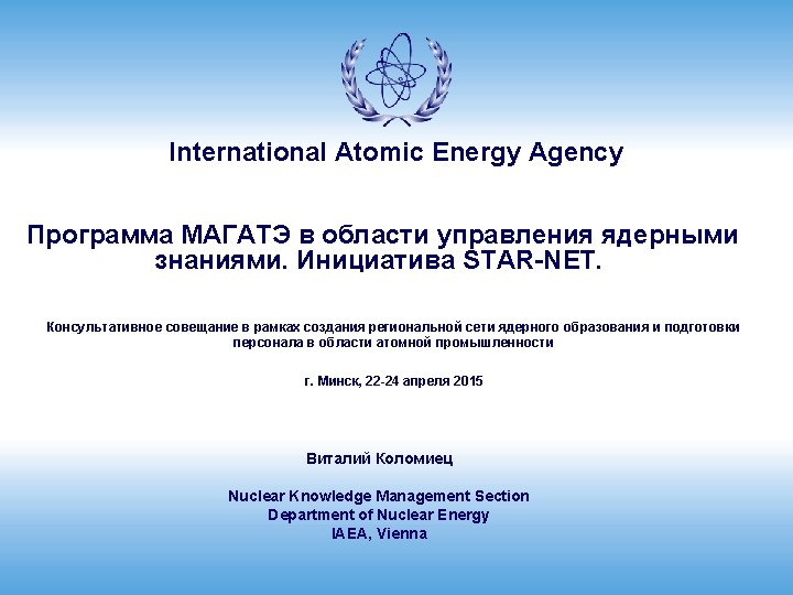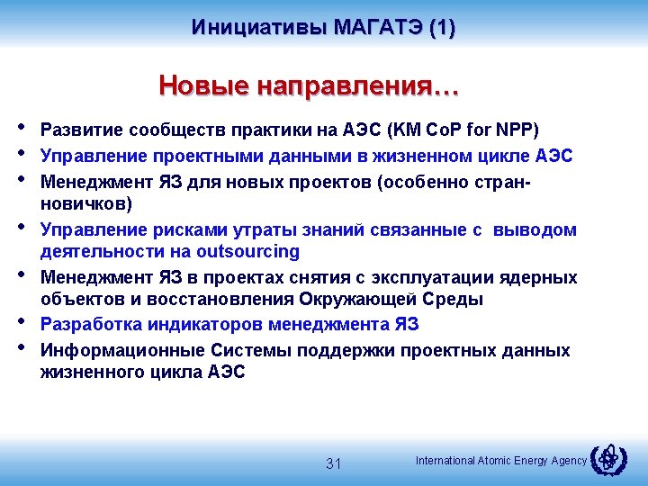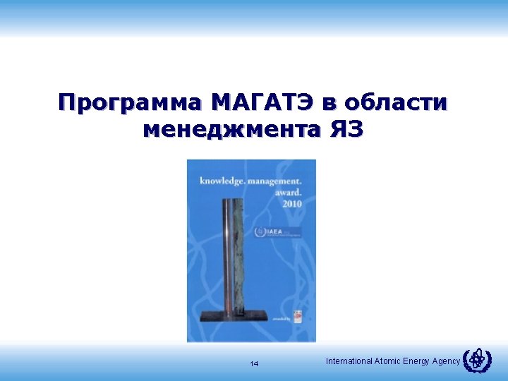 Эволюция программы МЯЗ в МАГАТЭ (1. 3. 3. ) Knowledge MANAGEMENT 2002 Meeting of Senior Officials st GC RES on Managing Nuclear Knowledge 2000 Knowledge CULTURE 2004 1 st NKM Conference ANENT, WNU SI established GC/RES on Managing Nuclear Knowledge 2003 2005 1 st KM Assist Visit NKM Methodology & Guidance developed 2007 2006/2007 2 nd NKM Conference Nuclear Knowledge Portal ANENT Cyber platform launched 3 rd GC RES 2009 2008/9 – 2010/11 1. Promoting Knowledge Management Culture 2. Providing Services 3. Developing knowledge products 4. Facilitate networking and knowledge sharing. 2011 2014 HRD Conference & NKM Programme developed 2014 Analyzing Needs Promoting NKM Guidance & Methodology Providing Services & Support International Atomic Energy Agency