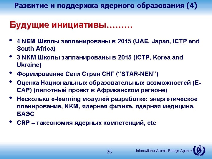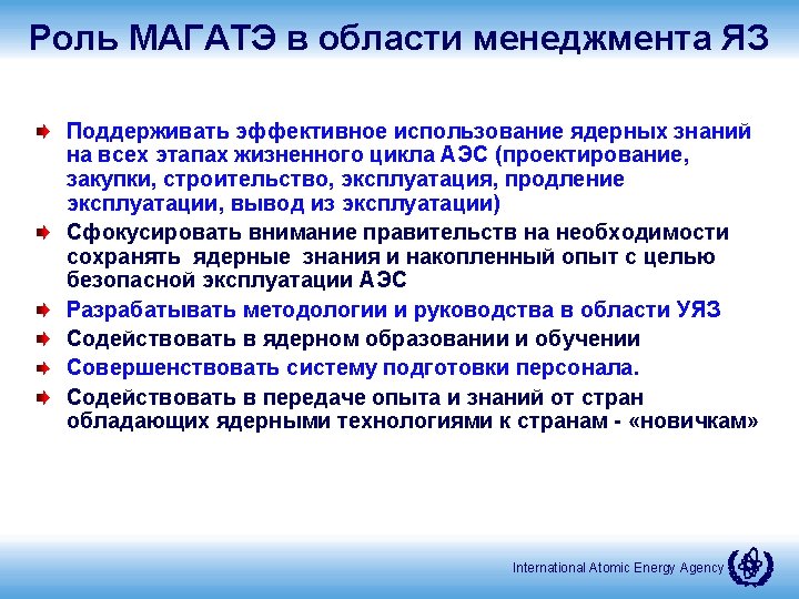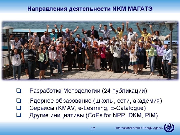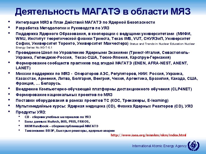 Публикации (in-progress 2) • • NKM for New Builds NKM for Outsourcing and Suppliers Management of Design Knowledge Over the Life-cycle IAEA Facilitated International Nuclear Management Academy (INMA) NKM for Decommissioning Organizations Application of Modern Plant Information Models to Support and Manage Design Knowledge throughout the NPP Life Cycle Educational Capability Assessment and Planning (ECAP) 24 публикации МАГАТЭ! International Atomic Energy Agency