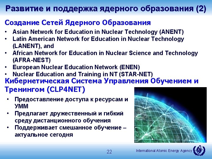 Развитие и поддержка ядерного образования (1) Nuclear Energy Management (NEM) Schools • 5 th NEM School at ICTP in Trieste, Italy – Nov. 2014 • 3 rd NEM School at U of Tokyo, Japan – June 2014 • С 2010 прошли подготовку более 150 специалистов и руководителей в школах ICTP, Japan, UAE, USA etc. • Более 125 кандидатов/год, ~35 отобрано. Nuclear Knowledge Management (NKM) Schools • 10 th NKM School at ICTP in Trieste, Italy – Aug. 2014. • С 2004 прошли подготовку более 300 молодых профессионалов. • Более 150 кандидатов/год, ~30 отобрано. 21 International Atomic Energy Agency