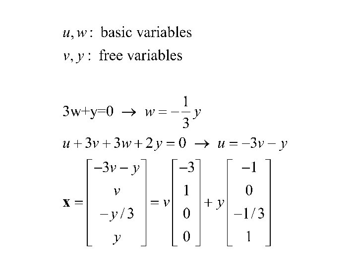 CONCLUSIONS • Suppose the mxn matrix A is reduced by elementary operations and row exchanges to a matrix U in echelon form. • Let there be r nonzero pivots; the last m-r rows of U are zero. Then there will be r basic variables and n-r free variables, corresponding to the columns of U with and without pivots.
