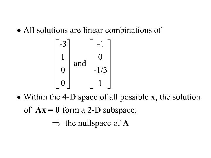 CONCLUSIONS • The nullspace, formed of solutions to Ax=0, has the n-r free variables as the independent parameters. If r=n, there are no free variables and the null space contains only x=0. • Solutions exist for every right side b iff r=m, then U has no zero rows, and Ux=c can be solved by back-substitution.