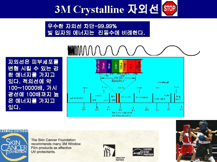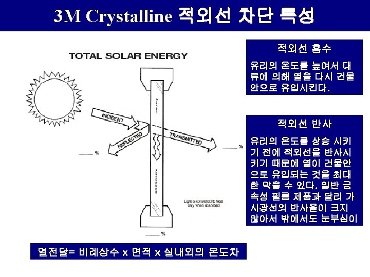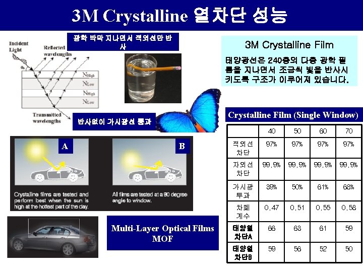 3 M Crystalline-전자파 차단 No Sheet Resistance Conductance (Ohm/Square) d. B Shielding Effectiveness* RE 35 SIARL 0. 0471 21. 23 18. 9 RE 35 NEARL 0. 0213 46. 95 11. 8 Crystalline 70 0. 0000 >10^5 0. 0 VISTA VS 70 0. 1550 6. 45 29. 3 VKOOL 70 0. 1863 5. 37 30. 9 VISTA V 50 0. 0653 15. 31 21. 8 RE 35 AMARL 0. 3440 2. 91 36. 2 * 0. 1 – 6 GHz 금속 물질이 포함된 필름은 전자파에 간섭을 일으킬 수 있 다. Crystalline film은 금속물질을 전혀 포함되어 있지 않 아 차안에서도 무선 기기를 불편없이 사용할 수 있다.