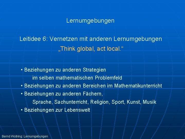 Lernumgebungen Leitidee 6: Vernetzen mit anderen Lernumgebungen „Think global, act local. “ • Beziehungen zu anderen Strategien im selben mathematischen Problemfeld • Beziehungen zu anderen Bereichen im Mathematikunterricht • Beziehungen zu anderen Fächern, Sprache, Sachunterricht, Religion, Sport, Kunst, Musik • Beziehungen zur Lebenswelt Bernd Wollring: Lernumgebungen
