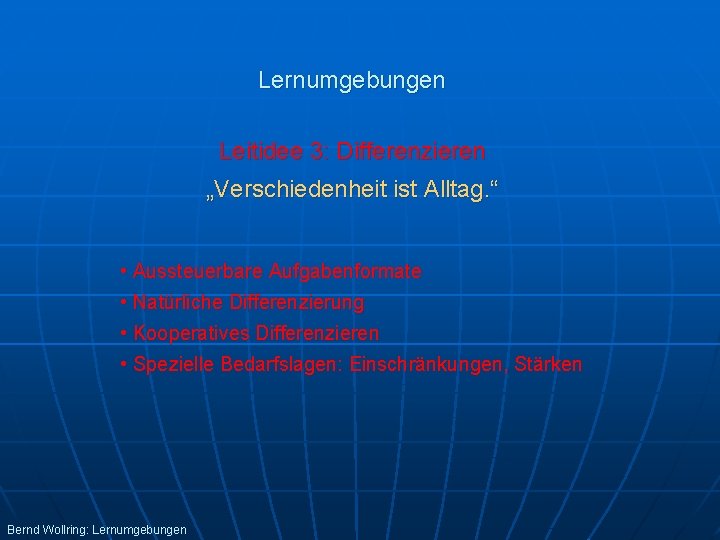Lernumgebungen Leitidee 3: Differenzieren „Verschiedenheit ist Alltag. “ • Aussteuerbare Aufgabenformate • Natürliche Differenzierung • Kooperatives Differenzieren • Spezielle Bedarfslagen: Einschränkungen, Stärken Bernd Wollring: Lernumgebungen