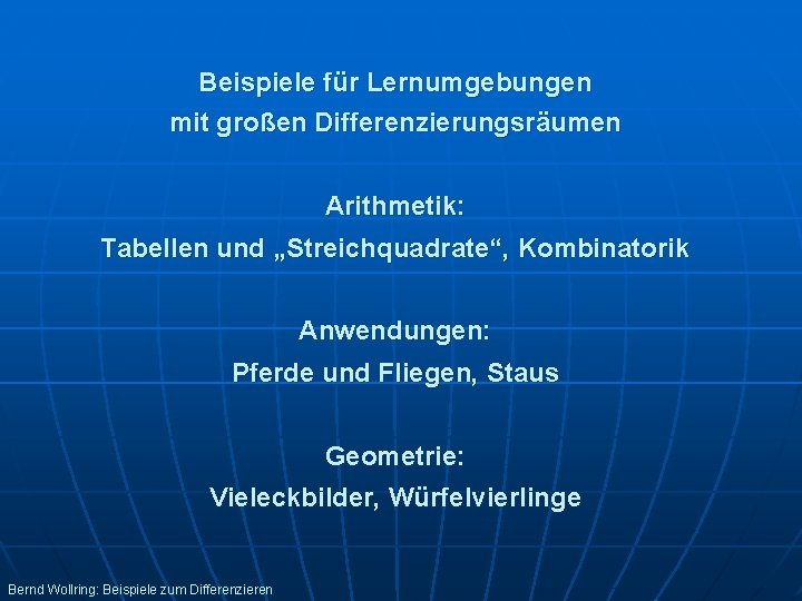 Beispiele für Lernumgebungen mit großen Differenzierungsräumen Arithmetik: Tabellen und „Streichquadrate“, Kombinatorik Anwendungen: Pferde und Fliegen, Staus Geometrie: Vieleckbilder, Würfelvierlinge Bernd Wollring: Beispiele zum Differenzieren