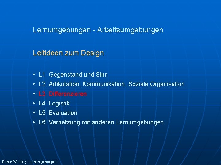 Lernumgebungen - Arbeitsumgebungen Leitideen zum Design • L 1 Gegenstand und Sinn • L 2 Artikulation, Kommunikation, Soziale Organisation • L 3 Differenzieren • L 4 Logistik • L 5 Evaluation • L 6 Vernetzung mit anderen Lernumgebungen Bernd Wollring: Lernumgebungen