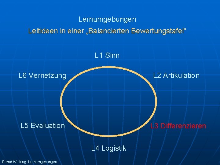 Lernumgebungen Leitideen in einer „Balanced Scorecard“ L 1 Sinn L 6 Vernetzung L 2 Artikulation L 5 Evaluation L 3 Differenzieren L 4 Logistik Bernd Wollring: Lernumgebungen