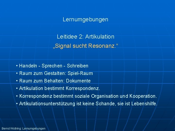 Lernumgebungen Leitidee 2: Artikulation „Signal sucht Resonanz. “ • Handeln - Sprechen - Schreiben • Raum zum Gestalten: Spiel-Raum • Raum zum Behalten: Dokumente • Artikulation bestimmt Korrespondenz. • Korrespondenz bestimmt soziale Organisation und Kooperation. • Artikulationsunterstützung ist keine Schande, sie ist Lebenshilfe. Bernd Wollring: Lernumgebungen