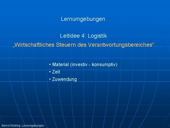 Lernumgebungen Leitidee 4: Logistik „Wirtschaftliches Steuern des Verantwortungsbereiches“ • Material (investiv - konsumptiv) • Zeit • Zuwendung Bernd Wollring: Lernumgebungen
