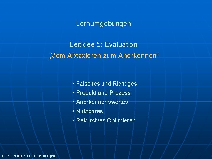 Lernumgebungen Leitidee 5: Evaluation „Vom Abtaxieren zum Anerkennen“ • Falsches und Richtiges • Produkt und Prozess • Anerkennenswertes • Nutzbares • Rekursives Optimieren Bernd Wollring: Lernumgebungen