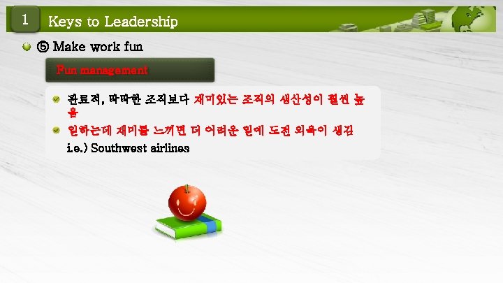 1 Keys to Leadership ③ MBWA(현장경영) Managing By Walking Around § Visible management(눈에 띄는 경영) by Tom Peters Managers spend time with employees, not just to observe them at work § but to talk with them about how things are going 경영자는 사람들 눈에 띄어야 함 § 가장 중요한 자리에서 함께 고민하고 있다는 사실을 社內外에 항상 알려야 함