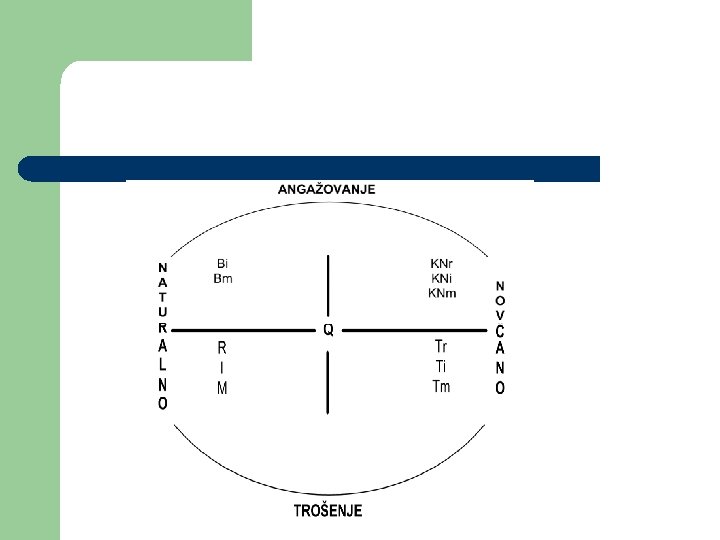 l Q - fizički proizvod; M - utrošak materijala; I - utrošak sredstava za rad; R - utrošak radne snage; τ - tehnološki proces; Tm - troškovi materijala; Ti - troškovi sredstava za rad; Tr - troškovi radne snage; C ukupan prihod; Do - dobit; Doδ - dobit za poreze; Dok - kamata (dobit za kamate); Don - preduzimačka dobit; Da - akumulacija; Dle stimulacioni lični dohodak; Dr - rezerve; DIV - dividenda; Ki · Ai - dio amortizacije koji se vraća u reprodukciju; Ka · Da - investirana akumulacija; KNm - kapital u novčanom obliku namijenjen angažovanju u obrtna sredstva u materijalu; KNi - kapital u novčanom obliku namijenjen angažovanju u osnovna sredstva; KNr - kapital u novčanom obliku namijenjen angažovanju u obrtna sredstva u zaradama; Bm - početni robni oblik angažovanog kapitala u obrtnim sredstvima u materijalu; Bi - početni robni oblik angažovanog kapitala u osnovnim sredstvima.